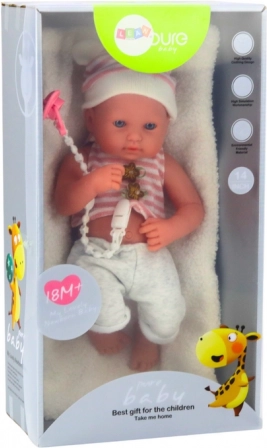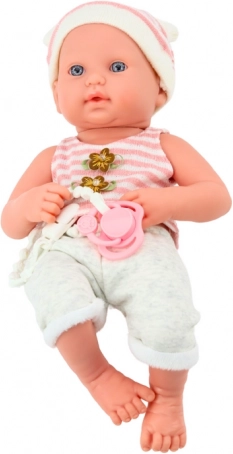 Prisrčna punčka dojenček v belo‑rožnatem kompletku s kapico je idealna spremljevalka za igro skrbi. Ima realistične poteze obraza, premične roke in noge, priloženi pa sta duda na vrvici in mehka odejica. Kakovostna in varna izdelava, primerno od 18 mesecev.