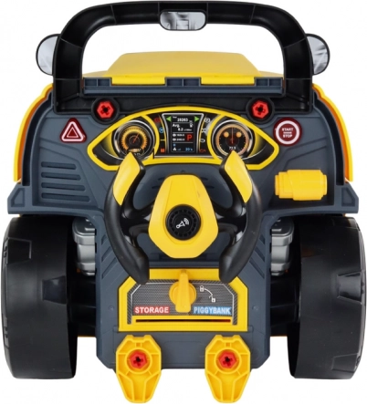 Rumeni delavniški avtobus za male ustvarjalce združuje zabavo in učenje: otroci lahko vozilo razstavljajo in ponovno sestavljajo, raziskujejo odpirajoč se pokrov motorja in kolesa, upravljajo volan s hupo, uživajo v svetlobnih in zvočnih učinkih in zahvaljujoč dvema velikima kolesoma svoj mobilni delavniški set zlahka prevažajo.
