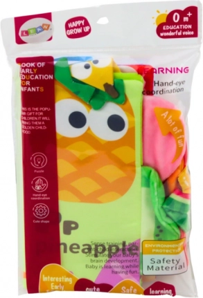 Ta lahka in trpežna tekstilna knjižica dojenčke pritegne s pisanimi ilustracijami sadja in interaktivnimi detajli. Mehke strani ob dotiku šumijo, piščalka vabi k stiskanju, izbočeni elementi pa k prijemanju, kar naravno razvija tip, sluh in koordinacijo oko–roka. Angleška poimenovanja sadja spodbujajo zgodnje spoznavanje besed na igriv način.