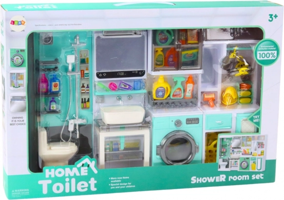 Ta premišljeni set je sestavljen iz 4 povezanih segmentov: pršni kot s straniščem, umivalnik z ogledalom, pralni stroj z omarico ter police z likalno desko. Turkizno-bela zasnova in natančna izdelava spodbujata domišljijo in otroke motivirata k posnemanju vsakdanjih opravil. Mere kompleta 35 × 26 × 8 cm se odlično podajo v otroško sobo in k hišici za punčke.