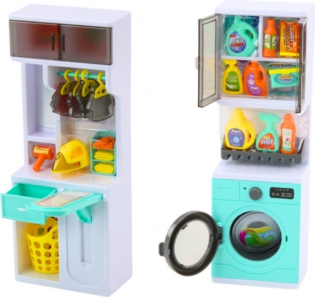 Prha s straniščem, umivalnik z ogledalom, pralni stroj z omarico in police z likalno desko sestavljajo zaokrožen igralni sklop za raznoliko igro doma.