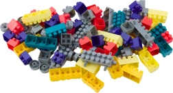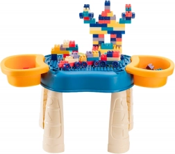 Miza ima površino za igro, na kateri lahko otroci sestavljajo različne konstrukcije iz barvnih kock.