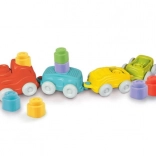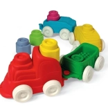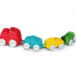 Lokomotiva in trije vagoni se enostavno spojijo in ločijo, zato si otroci lahko ustvarijo lastne kompozicije. Kolesa omogočajo gladko gibanje vlaka, kar spodbuja aktivno igro in razvoj domišljije. Kocke lahko vstavljate v vagone ali zlagate v stabilne stolpe – idealno za prve gradnje in kompozicije.