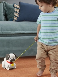 Ko otrok povleče za vrvico, mops začne premikati ušeska in tačke ter oddajati radostno lajež, ki vabi k nadaljnjemu raziskovanju.
