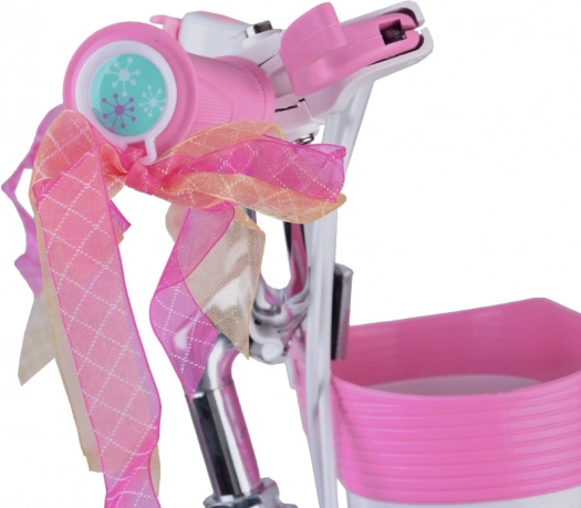 Ergonomsko krmilo z mehkimi ročaji, zvoncem in trakci bo razveselilo mlade kolesarke, medtem ko kombinacija sprednje čeljustne in zadnje bobnaste zavore prinaša gladko in varno zaviranje. Pomožna kolesa dodajo stabilnost pri učenju, praktična košara pa sprejme drobnarije. Vozniško udobje dopolnjuje mehko, po višini nastavljivo sedlo z ročajem za vodenje.