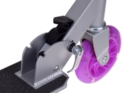Višino krmila je mogoče udobno nastaviti v treh korakih, penasti ročaji so prijetni na dotik, nedrseča stopna površina pa drži stopalo stabilno tudi pri daljši vožnji. Nožna zavora na zadnjem kolesu omogoča hitro in gladko ustavljanje, zložljivo stojalo pa olajša odlaganje kjerkoli.
