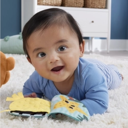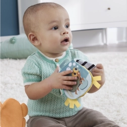 Tekstilna knjižica s kontrastnimi barvami, šumečimi detajli in varnim ogledalcem podpira senzorični razvoj, osredotočenost in koordinacijo roka–oko. Kompaktne mere vidre in knjižice jih delajo odlična spremljevalca za doma in na poti.