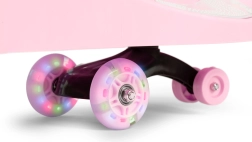 Gumijasta kolesa zagotavljajo tiho in gladko delovanje ter hkrati ne opraskajo tal, zato je odrivalnik idealen tako za stanovanje kot za vrt. Vgrajene LED diode v kolesih se med vožnjo prižgejo in povečajo vidnost v somraku, kar prinaša več zabave in varnosti.