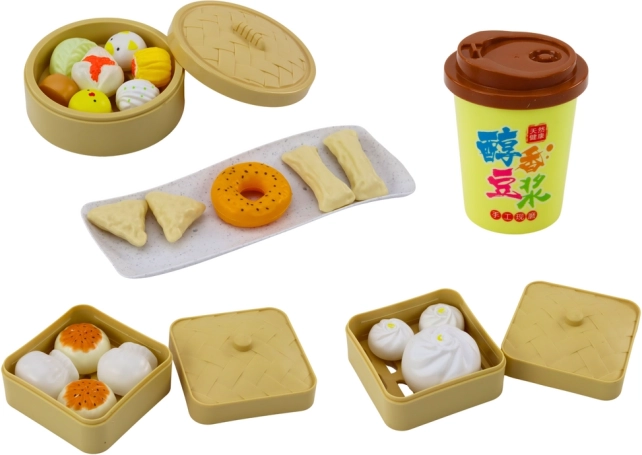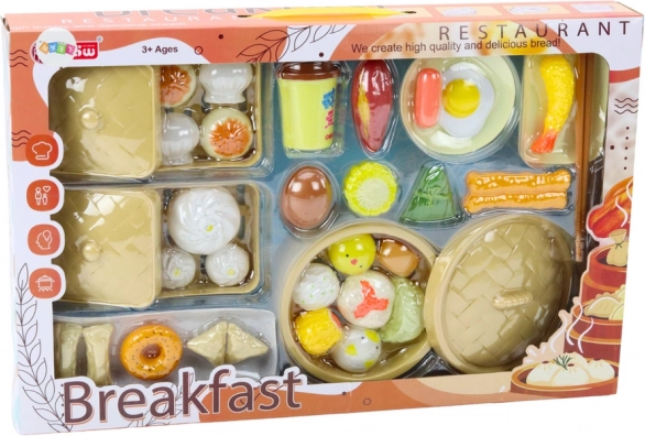 Ta set vsebuje vse, kar majhne roke potrebujejo za pripravo okusnega, namišljenega zajtrka. Vključuje barvite in funkcionalne posode za hrano, eleganten lonček za jutranjo kavo za posnemanje odraslih, različne vrste zelenjave, ki jih lahko režejo in postrežejo, pripravljene prigrizke, ki izgledajo kot pravi, elegantne krožničke in palčke za učenje prehranjevanja v azijskem slogu.