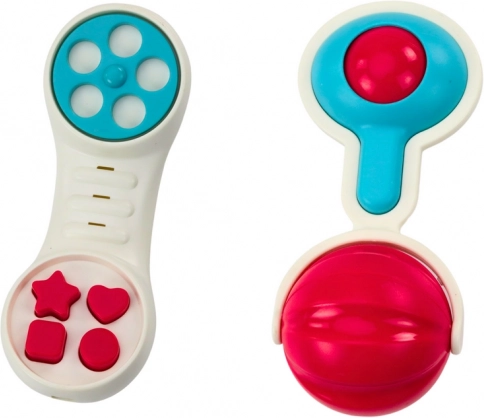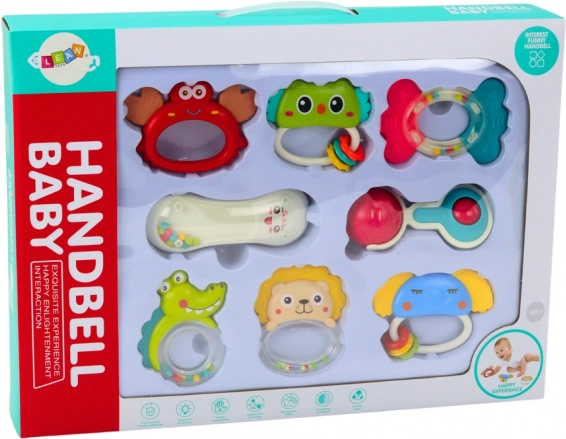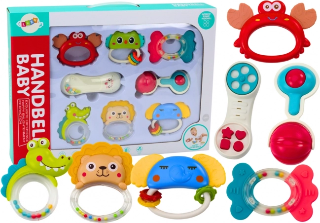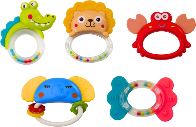 Set ponuja ropotuljice v obliki krokodila, leva, rakovice, slona in ribe, ki so živih barv za stimulacijo vizualnega zaznavanja.