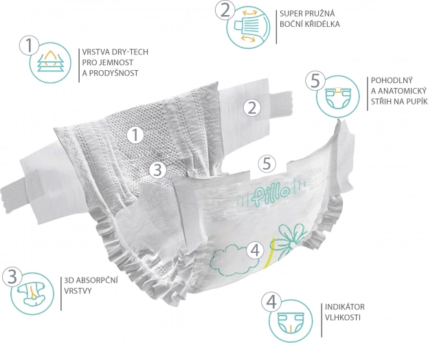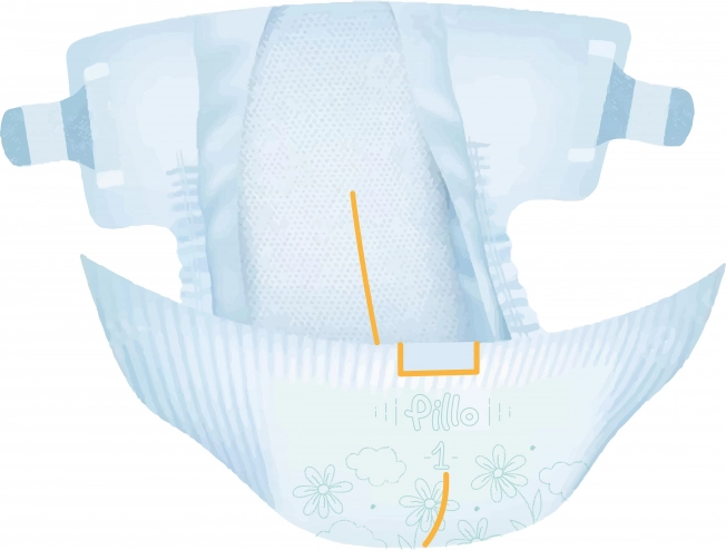 • Indikator vlažnosti: rumena črta se ob vlagi obarva modro in tako signalizira čas za previjanje.
