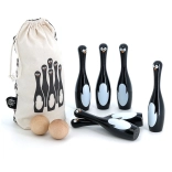 Celoten set je dostopen v praktični bombažni vrečki, kar ne olajša samo prenašanje, ampak tudi shranjevanje. Igračo je enostavno vzeti s seboj na izlete ali počitnice, da bo vašim otrokom priljubljena zabava vedno na voljo. Pokažite svojo spretnost in podrite čim več kegljev z enim metom!