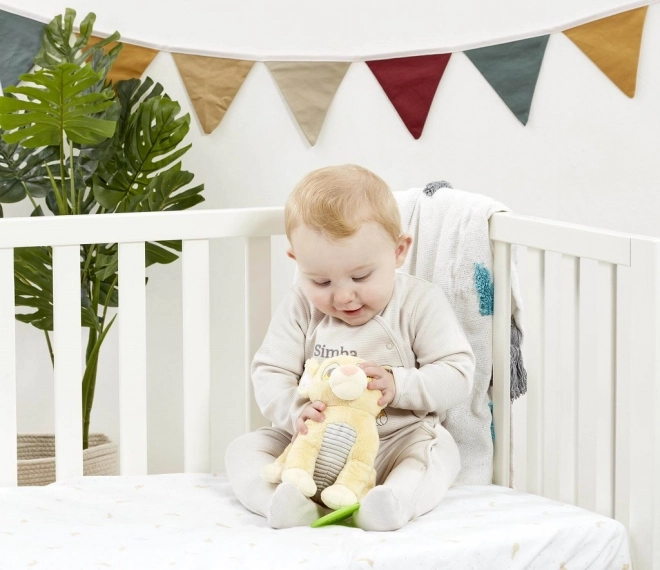 Spoznajte malega levčka Simbo – mehkega prijatelja za vsak dan. Plišasta igrača združuje pomirjujočo mehkobo s premišljenimi detajli za senzorično raziskovanje: teksturiran trebušček, nežno obrobljena ušeska in listno grizalo za olajšanje pri izraščanju zobkov.