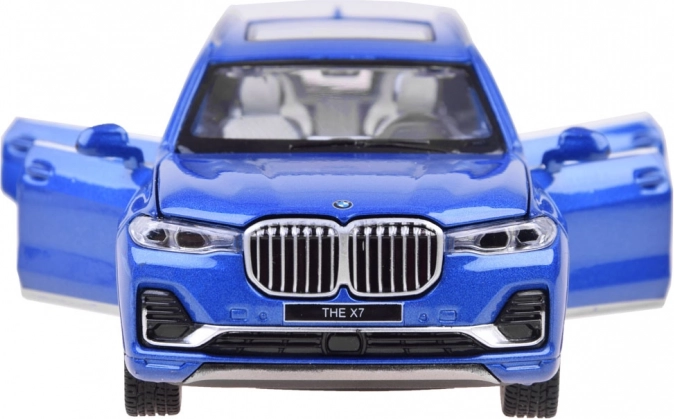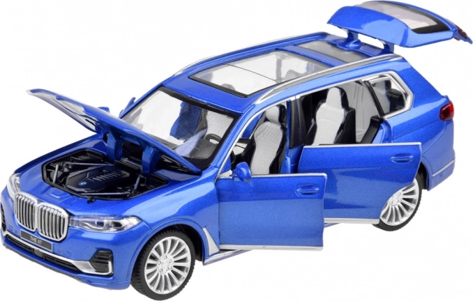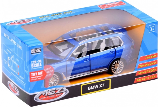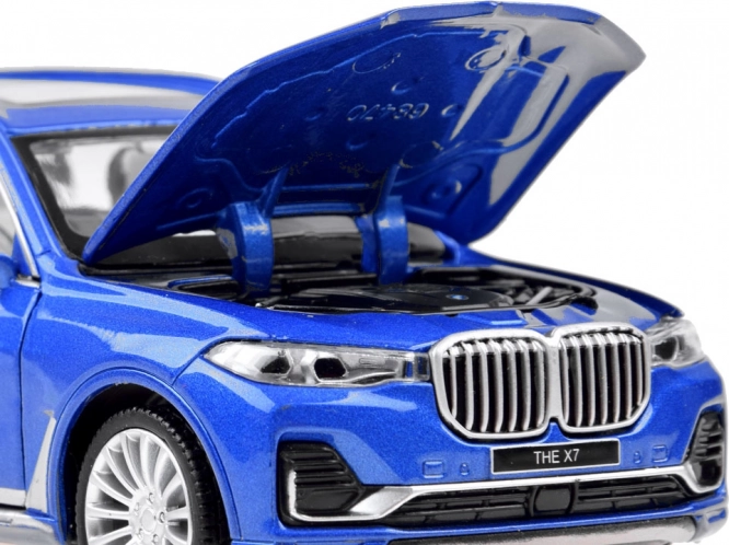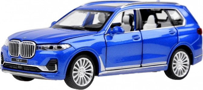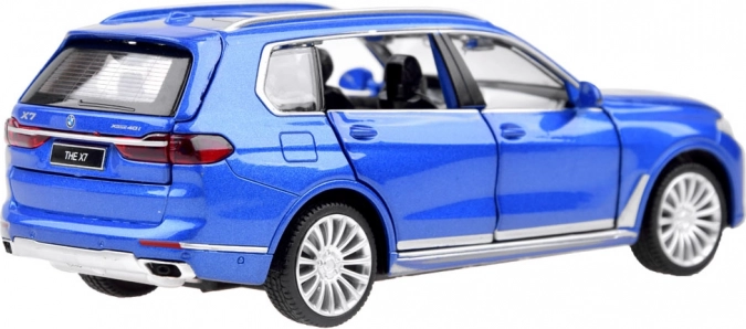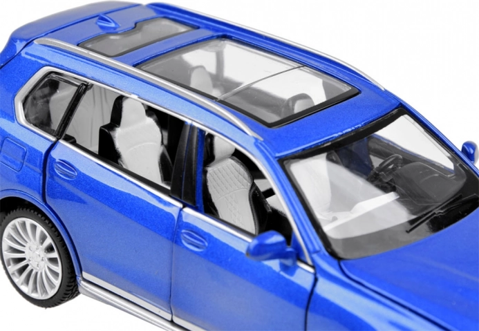 Kovinski model SUV BMW X7 1:32 s svetlobnimi in zvočnimi učinki ter vzvratnim pogonom. Odpirajo se vrata, pokrov motorja in prtljažnik, modra kovinska barva. Odlično za otroke in zbiratelje.