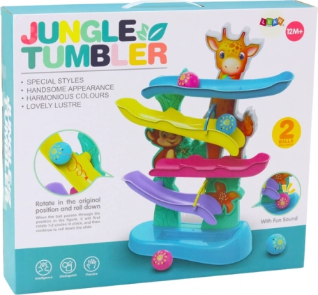 Interaktivna kroglična steza žirafa in opica z zvoki. Razvija motoriko in koordinacijo, varna izvedba, 2 kroglici, napajanje 2× AA. Za otroke od 3 let.