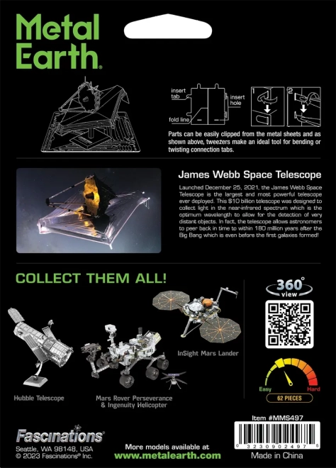 Ta 3D kovinski model teleskopa Jamesa Webba izstopa po natančnem laserskem graviranju in realističnih detajlih, vključno z ikoničnim zlatim segmentiranim ogledalom ter konstrukcijo sončnega ščita. Sestavljanje zahteva potrpežljivost in natančnost, nagrada pa je impresiven zbirateljski kos za razstavitev.