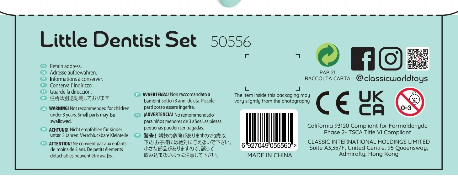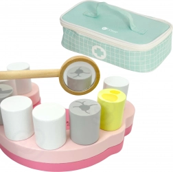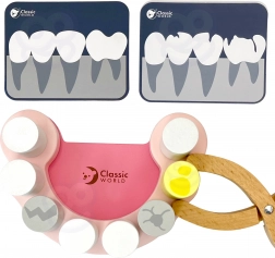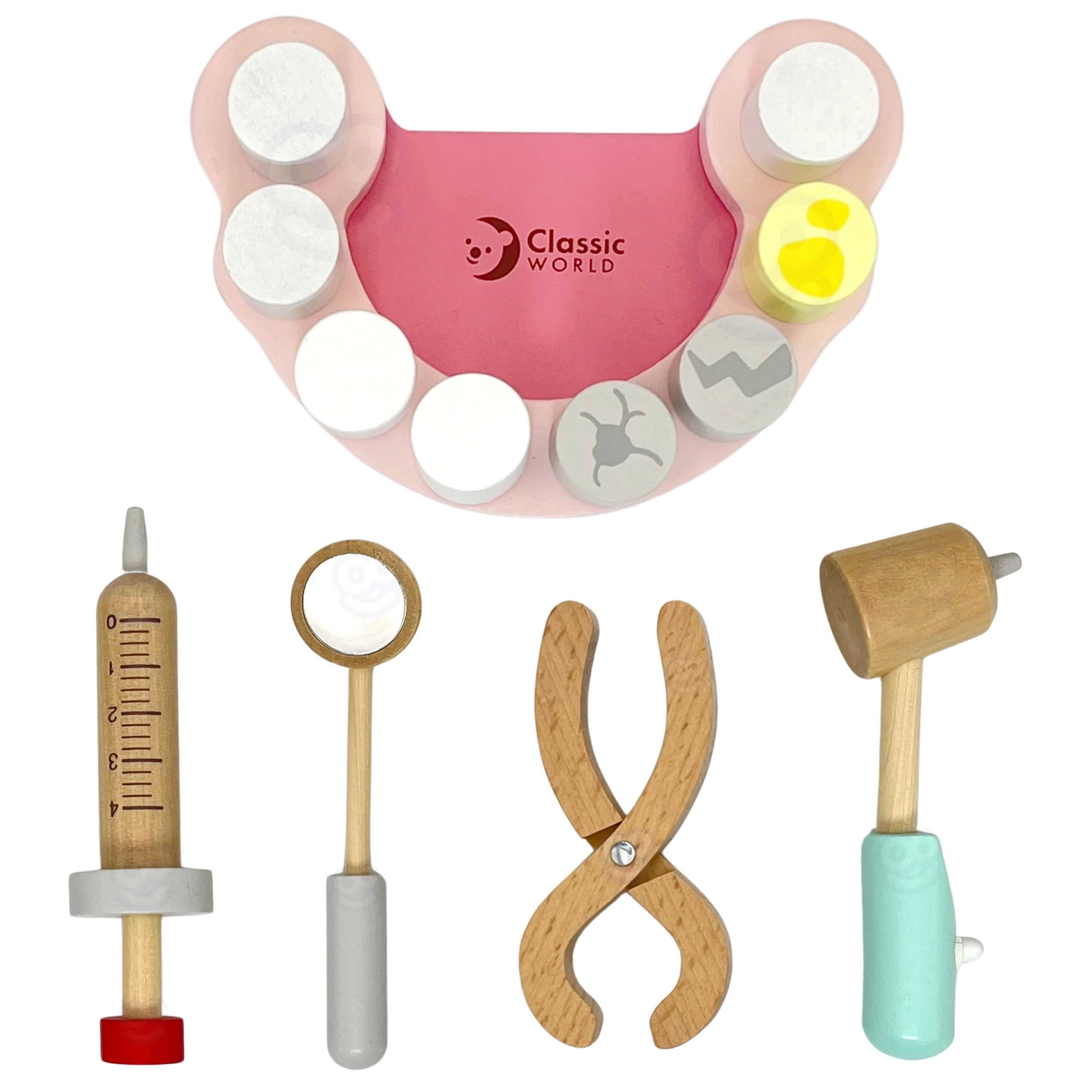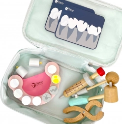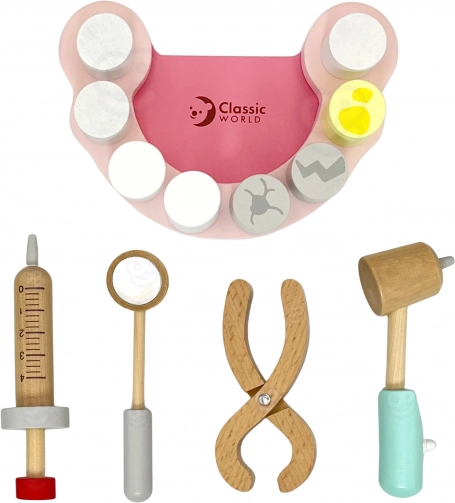 Komplet malega zobozdravnika Classic World otrokom nudi varen prostor za raziskovanje sveta stomatologije. Z realističnimi lesenimi orodji in modelom dlesni se naučijo, kako poteka pregled, zakaj je pomembna nega zob in kaj se zgodi, ko na higieno pozabimo. Igra naravno krepi komunikacijske veščine in samozavest.