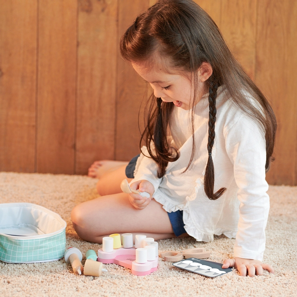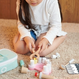 Premium izvedba iz naravnega lesa zagotavlja trpežnost in dolgo življenjsko dobo. Praktičen kovček drži vse dele skupaj, zato je komplet idealen tudi za potovanja. Zaradi privlačne zasnove v nežnih barvah je odlična darilo za otroke od 3 let dalje.