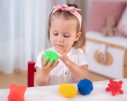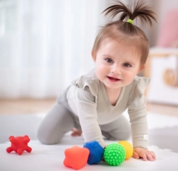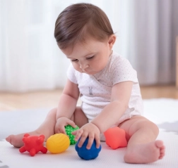 Vsaka žogica ima edinstveno površino, ki spodbuja tip in motivira otroke k raziskovanju, stiskanju in prijemanju.