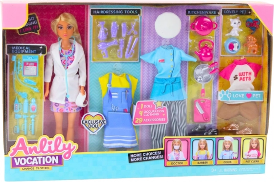 Punčka ANLILY z dolgimi svetlimi lasmi prihaja z več kompleti oblačil in tematskimi dodatki, da se v hipu preobrazi v zdravnico, frizerko, kuharico ali skrbnico hišnih ljubljenčkov. Vsaka vloga ponuja drugačne igralne scenarije in spodbuja razvoj socialnih veščin ter ustvarjalnosti.