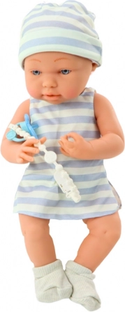 Dojenček Lutka oblečena v belo-modrem obleku, slinčku, nogavicah in kapi, kar ji dodaja edinstven šarm. Premikajoče se roke in noge omogočajo otroku interaktivno igranje, ki razvija ročne spretnosti in kreativnost. Realistične obrazne značilnosti prispevajo k avtentičnosti in poglobijo otroške dogodivščine.