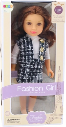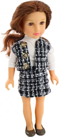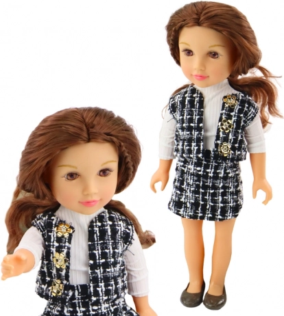 Punčka se ponaša z elegantno opravo, ki jo sestavljata črno-belo karirasto krilo in telovnik, skupaj pa ustvarjata edinstven slog. Bela srajca z dolgimi rokavi dopolnjuje celoten videz in doda klasičen pridih.