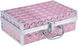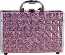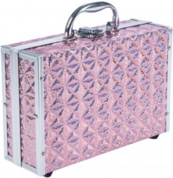 Rožnati kovček z teksturirano površino, kovinskim ročajem in zanesljivim zapiranjem izgleda odlično ter ščiti vašo kozmetiko doma in na poti.