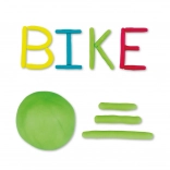 Slika prikazuje barvne črke »BIKE«, izdelane iz modelirne mase ali testa za igro, kar spodbuja ustvarjalno in interaktivno učenje.