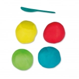 Slika prikazuje štiri barvne kroglice plastelina – rumeno, rdečo, zeleno in turkizno. Ustvarjalna igrača za modeliranje in oblikovanje v različne oblike.