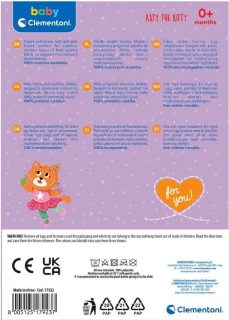 Plišasta igračka mucka Katka znamke Clementoni Baby je idealen spremljevalec za malčke. Je mehka, barvita in polna privlačnih detajlov, ki pritegnejo pozornost ter spodbujajo senzorični razvoj dojenčkov.