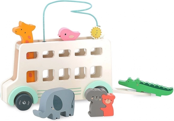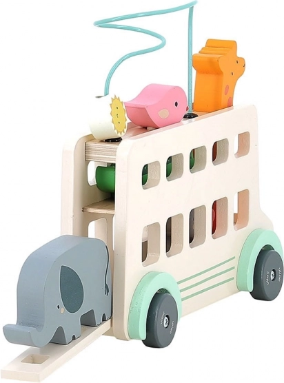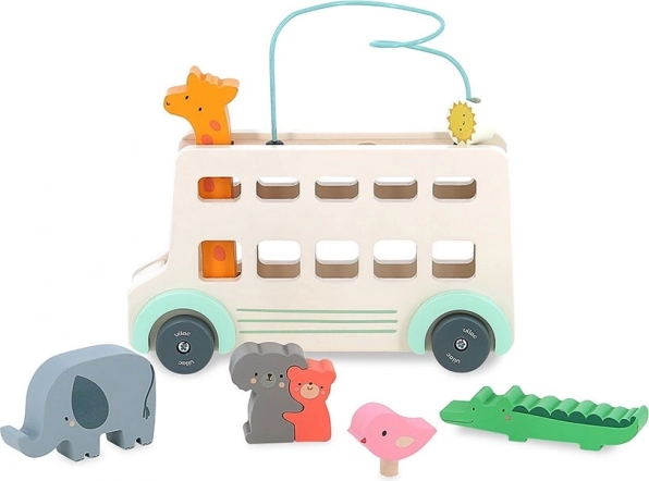 Leseni avtobus ponuja veliko interaktivnih elementov, kot so izrezi za okna, pisane živalske figure in labirint s perlicami na strehi, ki spodbujajo ustvarjalnost.