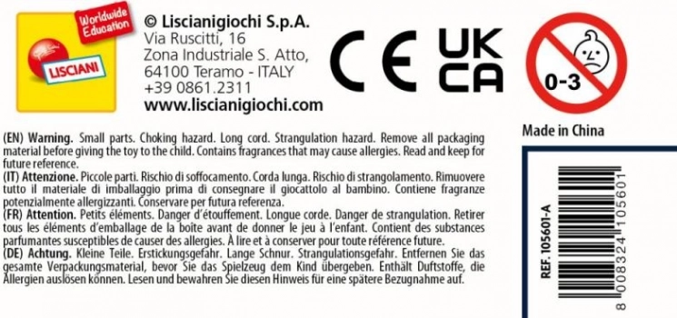- CE, UKCA; ni primerno za otroke, mlajše od 3 let (nevarnost zadušitve in zadušitve z vrvico)