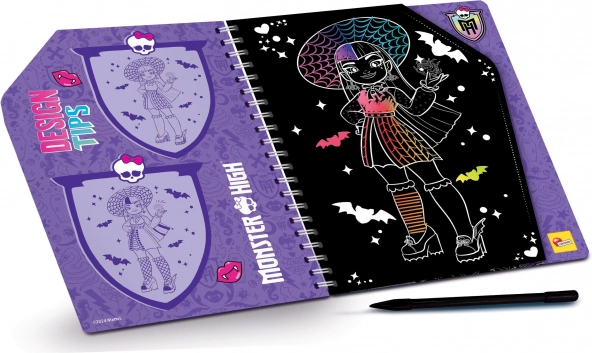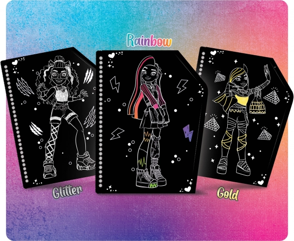 Odkrijte zabaven način risanja in okraševanja s praskalnim skicirjem Monster High. Dovolj je, da rahlo postrgate črno površino in razkrijete osupljive barvne učinke, ki bodo vašim stvaritvam dodali edinstven slog.