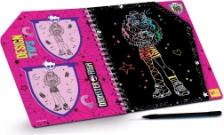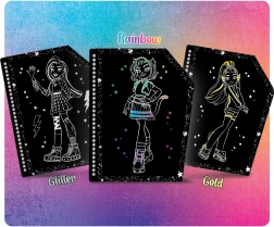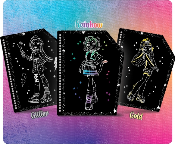 Ustvarjajte izvirne slike svojih najljubših likov iz MONSTER HIGH in opazujte, kako se pod črno plastjo pojavijo živahne barve. Zahvaljujoč trem vrstam učinkov – zlati, bleščeči (brokatni) in mavrični – bo vsako delo edinstveno in očarljivo.