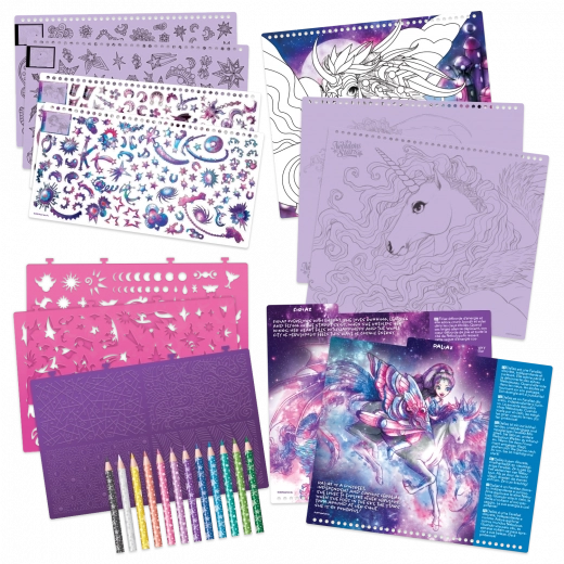 Odkrijte čar ustvarjalnega ustvarjanja s pobarvankami Nebulous Stars v vijolični izvedbi. Ta bogato opremljen set ponuja vse za ustvarjanje čarobnih risb fantazijskih konjev – od nalepk in šablon do plastičnih modelčkov in barvic. Idealno za otroke od 7 let, ki obožujejo domišljijo, barve in natančne detajle. Ustvarite svoje zvezdne zgodbe ter razvijajte fino motoriko in domišljijo s 250 nalepkami, 80 šablonami in 12 barvicami v enem paketu.