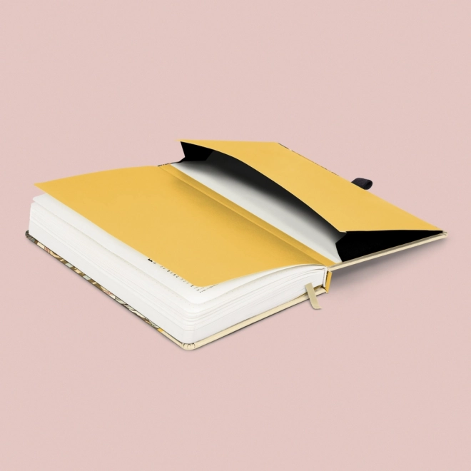 Elegantna beležnica z motivom dela Alfonse Muche v trdih platnicah ponuja 172 pikčastih strani na rumenem papirju, elastično zapiranje z gumico, notranji žep za drobnarije in zanko za svinčnik – idealna za zapiske, načrtovanje in ustvarjalno skiciranje.