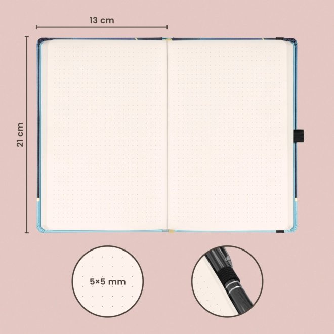 Elegantna beležnica z motivom dela Alfons Mucha – Luna v trdih platnicah. Ponuja pikčasto notranjost za ustvarjalne zapiske, elastični trak za zapiranje, žep za drobnarije in zanko za svinčnik. V notranjosti je 172 strani na prijetnem rumenem papirju velikosti 13 × 21 cm – idealno za načrtovanje, bullet journal in skiciranje.