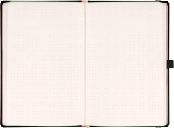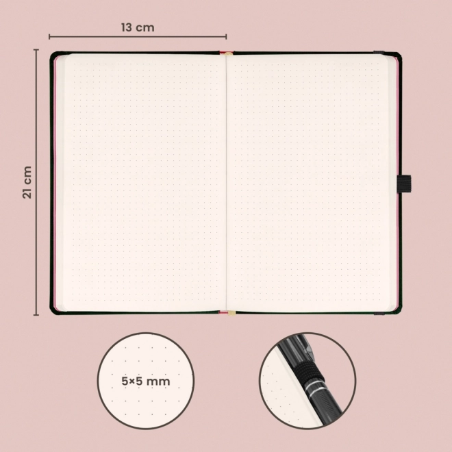 Pikčaste strani omogočajo svobodo za natančno načrtovanje, risanje in ustvarjanje preglednih zapiskov. Zapiranje z elastiko vse drži skupaj, zadnji žep skrije drobnarije, zanka pa poskrbi, da imate pisalo vedno pri roki.