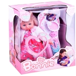 Ljubka interaktivna dojenčkova punčka bo razveselila vsako malo skrbnico. Ima mehko plišasto telesce, plastično glavico in okončine ter ponuja zvoke, kot so gugutanje, smeh, “mama” in “ata”, pitje iz stekleničke, jok in kolcanje/podiranje kupčka. Priložene so skledica, žlička, duda, steklenička in ropotuljica.