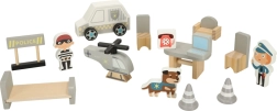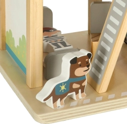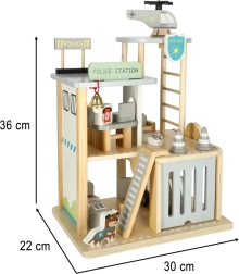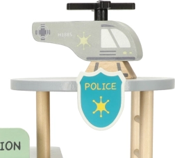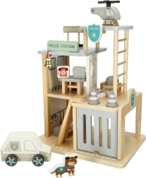 Ta premišljeni leseni set popelje otroke v svet reševalnih akcij. V pritličju sta garaža za policijski avto in celica za tatu, na sredini pisarna poveljnika in na strehi heliport za hitre odhode. Gladko obdelan les zagotavlja varno rokovanje in dolgo življenjsko dobo igrače.