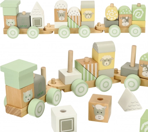 Pastelni leseni vlakec LULILO je idealna igrača za male graditelje. Otroci lahko poljubno kombinirajo bloke in ustvarjajo vedno nove kompozicije ali pa kocke uporabljajo samostojno. Vsak košček je gladko brušen in barvan z netoksičnimi barvami v nežnih odtenkih, dopolnjenimi s prikupnimi motivi živalic.