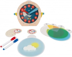 Del paketa je komplet 14 izbrisljivih kartic in 2 barvna flomastra, s katerima si otroci lahko zapisujejo in ponavljajo različne časovne situacije – od jutranjega vstajanja do večernega odhoda v posteljo. Odporna lesena zasnova zagotavlja dolgo življenjsko dobo in varno uporabo.