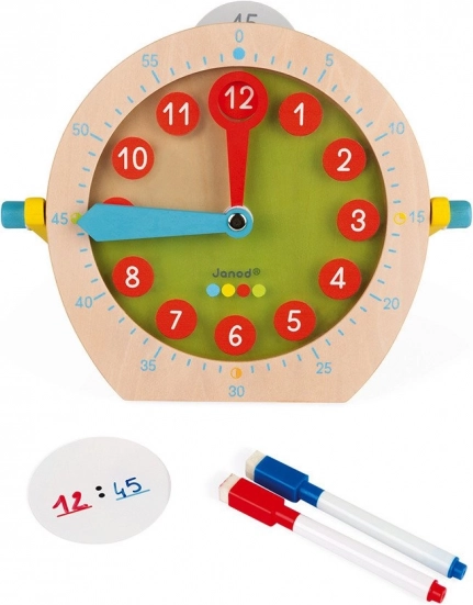 Odkrijte zabaven način, kako se otroci naučijo prepoznavati čas: lesena ura JANOD z izbrisljivimi karticami in dvema flomastroma. Zahvaljujoč jasnim številkam, gladko nastavljivim kazalcem in praktičnim karticam za zapisovanje bodo otroci na igriv način vadili branje ure, zaznavanje časa in fino motoriko. V kompletu je skupno 14 kartic in 2 flomastra. Učna ura za otroke od 3 let, gladko nastavljivi kazalci, izbrisljive kartice za večkratno uporabo.