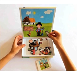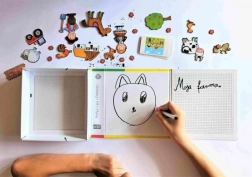 Ta pametni komplet združuje pisanje, brisanje in sestavljanje magnetnih slik v eno kompaktno igro. Otroci lahko vadijo črke in številke, rišejo z izbrisljivim flomastrom in ustvarjajo lastne prizore s kmetije. Zahvaljujoč magnetom posamezni delčki dobro držijo na podlagi, zato je idealna zabava v avtu in doma.