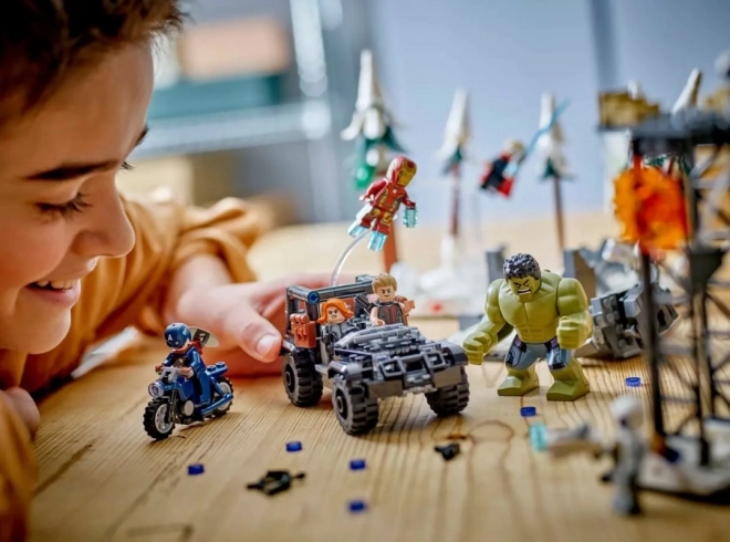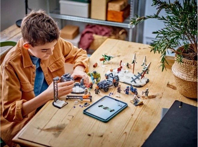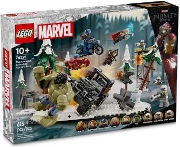 Zgradite in ponovno doživite epski boj iz filma Avengers: Doba Ultrona. Set vključuje pet medsebojno povezljivih modulov, ki jih je mogoče prosto preurejati in kombinirati v učinkovit prizor. Ne manjka terensko vozilo s premičnimi kolesi, orožje in množica dodatkov za kreativno igro vlog.