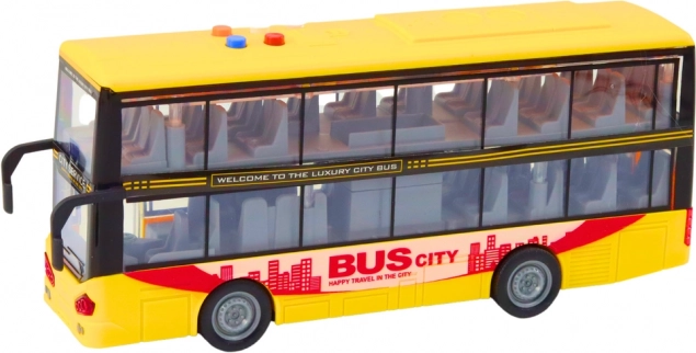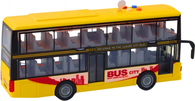 Avtobus v ikonični rumeni barvi zvesto posnema pravi turistični double-decker. Otroci lahko vključijo hupo, zvok motorja in opazujejo utripajoče luči, kar poveča realističnost igre. Pogon z vztrajnikom zagotavlja gladko vožnjo – dovolj je rahel potisk in avtobus se zapelje.