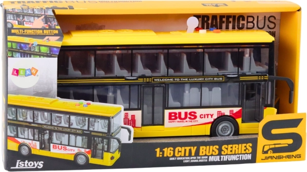 Realistični dvonadstropni avtobus v merilu 1:16 bo razveselil male oboževalce mestnih vozil. Ponuja svetlobne in zvočne učinke, pogon z vztrajnikom ter odpirajoča se vrata. Zaradi trpežne plastike in izrazite rumene barve je idealen za domiselno igro doma in na poti.