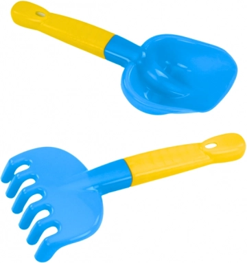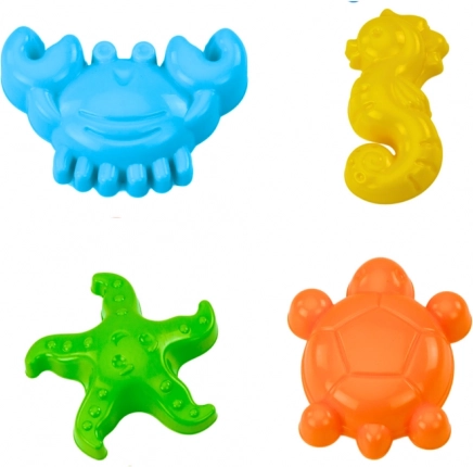 Ergonomska lopatka in grabljice lepo sedejo v otroške roke. Komplet štirih modelčkov (rak, morska zvezda, morski konjiček, želva) spodbuja domišljijo.