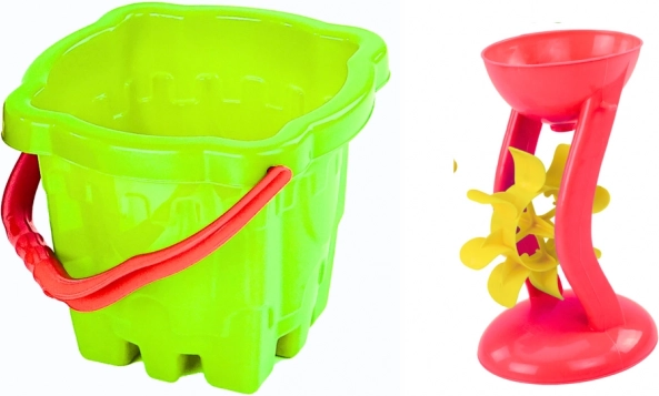 Barvit komplet igrač za pesek z vedrom v obliki gradu, mlinčkom, lopatko, grabljicami, štirimi modelčki in sitom prinaša ure zunanje zabave. Vse je izdelano iz trpežne plastike, varne za otroke, z privlačnimi barvami, ki spodbujajo igro. Spodbuja ustvarjalnost, razvoj fine motorike in koordinacijo gibov. Primerno za plažo, peskovnik in vrt.