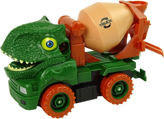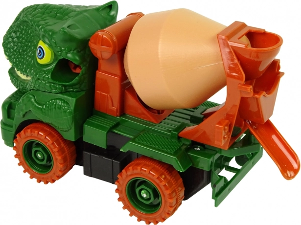 Dinozavrska glava z izrazitimi potezami in vrteči se mešalni boben spodbujata kreativne gradbene prizore in domišljijsko igro.